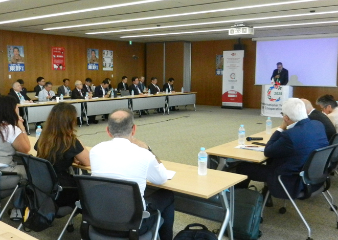 大阪万博を機に来日しているイタリアのレーガコープの訪日団と日本の国際協同組合同盟(ICA)会員団体とが交流を深めるとともに、「若者とデジタル化」「高齢化と人口減少」をテーマに、課題と取組みを学び合うもの。テーマごとの分科会、全体会における両分科会からの報告、質疑応答や意見交換が行われた。