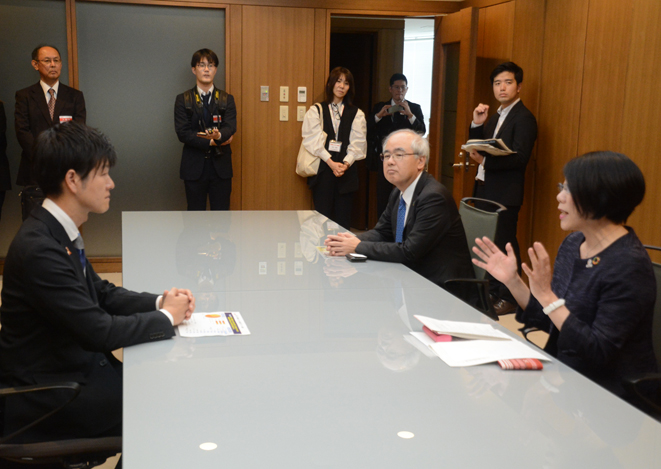 鈴木農相が食料品価格に関して消費者団体と意見交換=4日(日本生協連の新井会長と意見を交わした。東京・渋谷区のコーププラザで)