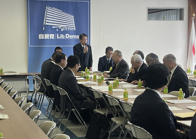 自民党総合農林政策調査会等が合同会議開き、JA全中等農業団体関係等から令和8年度農林・食品関係税制改正に関する団体要請を受けた=7日(挨拶する宮下調査会長)