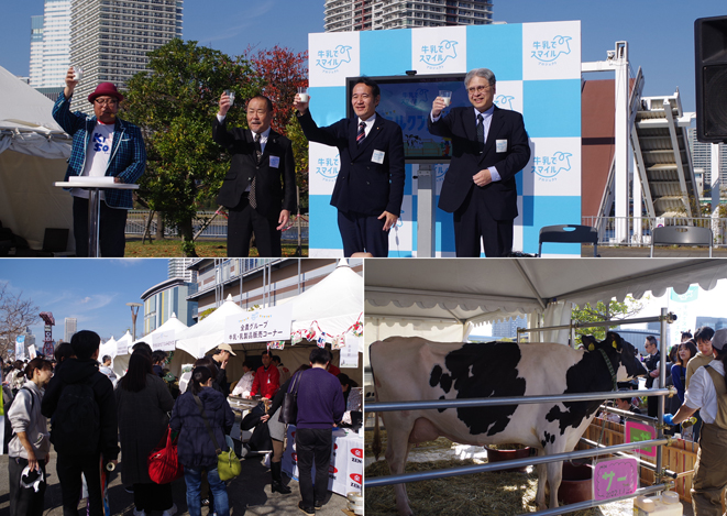 Jミルクが「牛乳でスマイルプロジェクトミルクフェスin豊洲」を開催=15日(オープニングセレモニーで行われた牛乳による乾杯㊤、乳牛の展示㊨、全農グループのブースの模様。都内で
