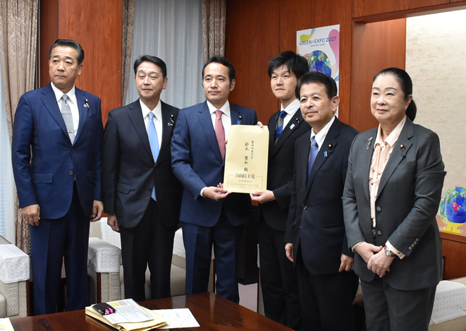 自民党の食と農への消費者の理解醸成と行動変容に向けた施策検討PT等が農水省に対し提言を提出=18日(鈴木農相が要請書を受け取った)