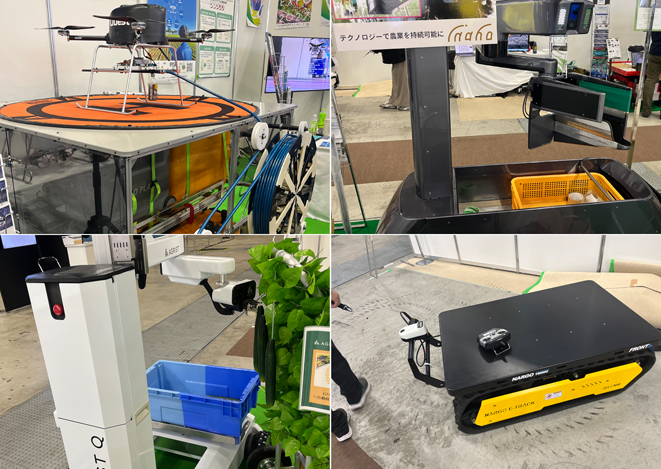 農水省が「国際ロボット展」にブース出展、農業用ロボット等を展示=3~6日(右上から下へ、inahoのミニトマト自動収穫ロボット、SEEDsロボティクスの不整地移動用クローラーロボット、Suzakの有線給電型ドローン、AGRISTのAI搭載自動収穫ロボット)
