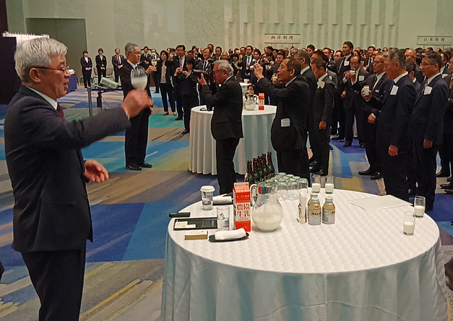 牛乳で乾杯する折原会長