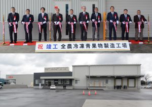 国産野菜の生産振興にJA全農が冷凍青果物製造工場を茨城県・坂東市に竣工=26日(竣工式で全農の八木岡副会長、桑田理事長、農水省佐藤審議官らがテープカット㊤、工場正面の外観)